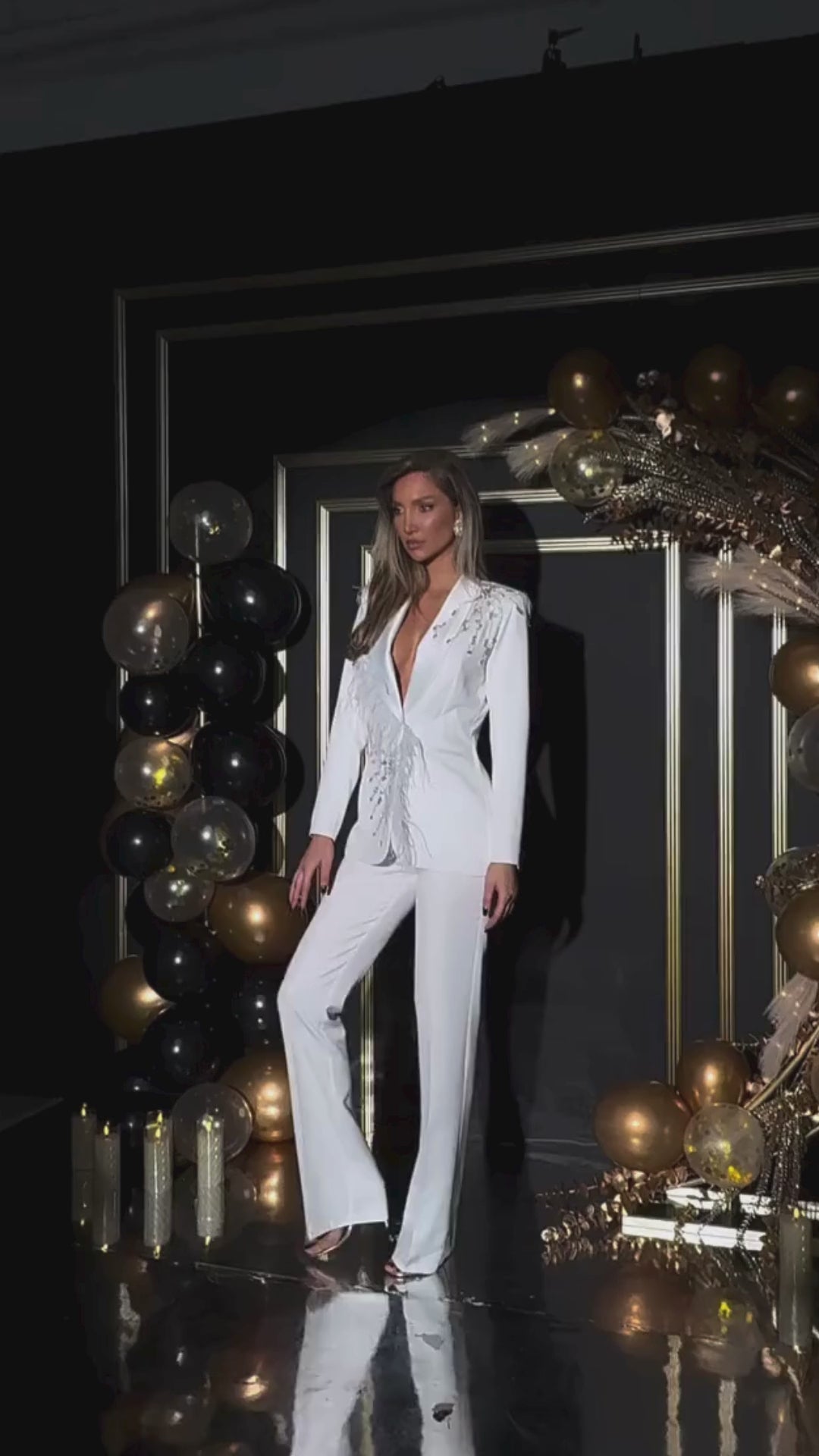 Completo tailleur bianco bby giacca a v con piume applicazioni argento e pantaloni a gamba larga