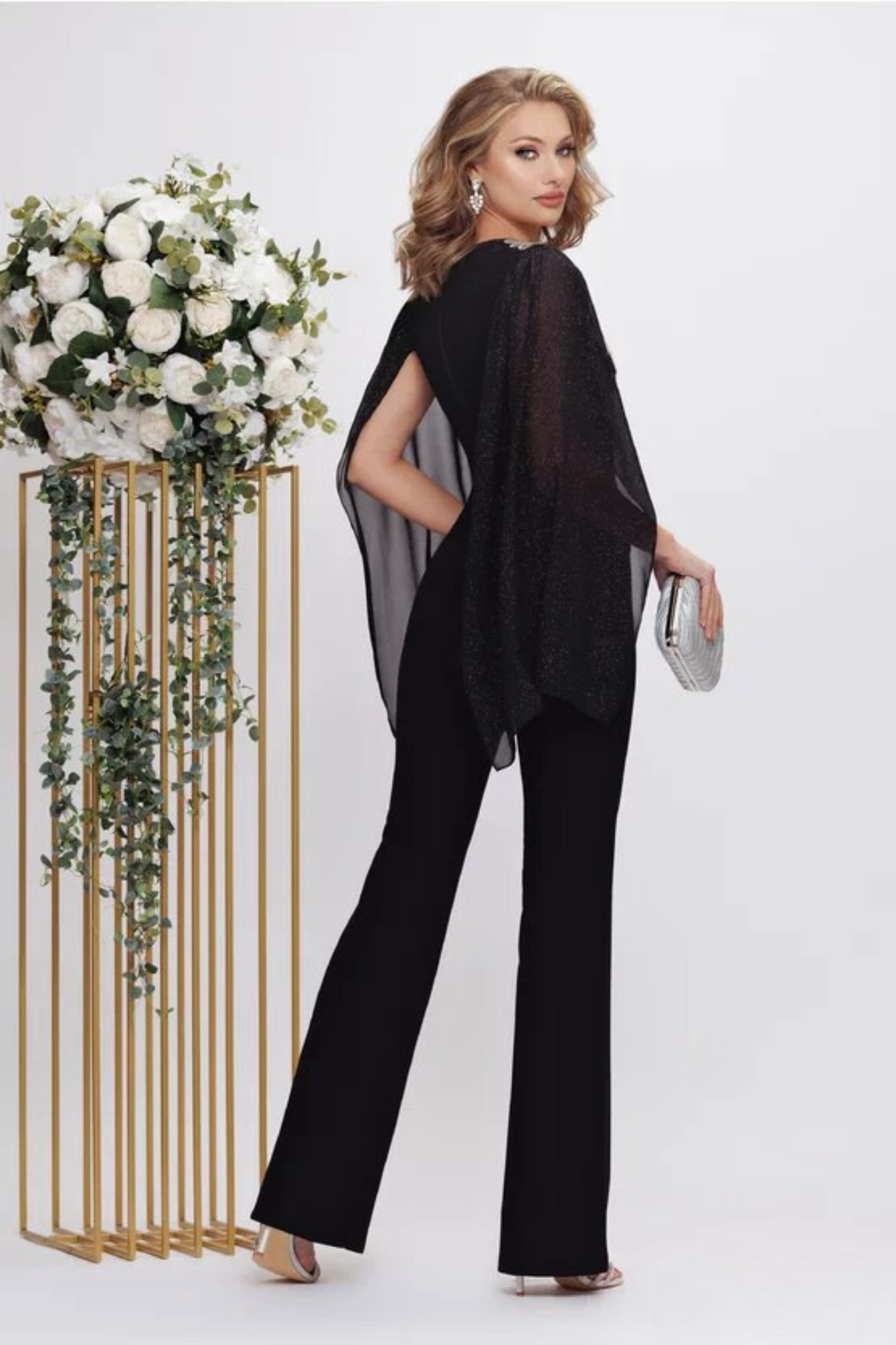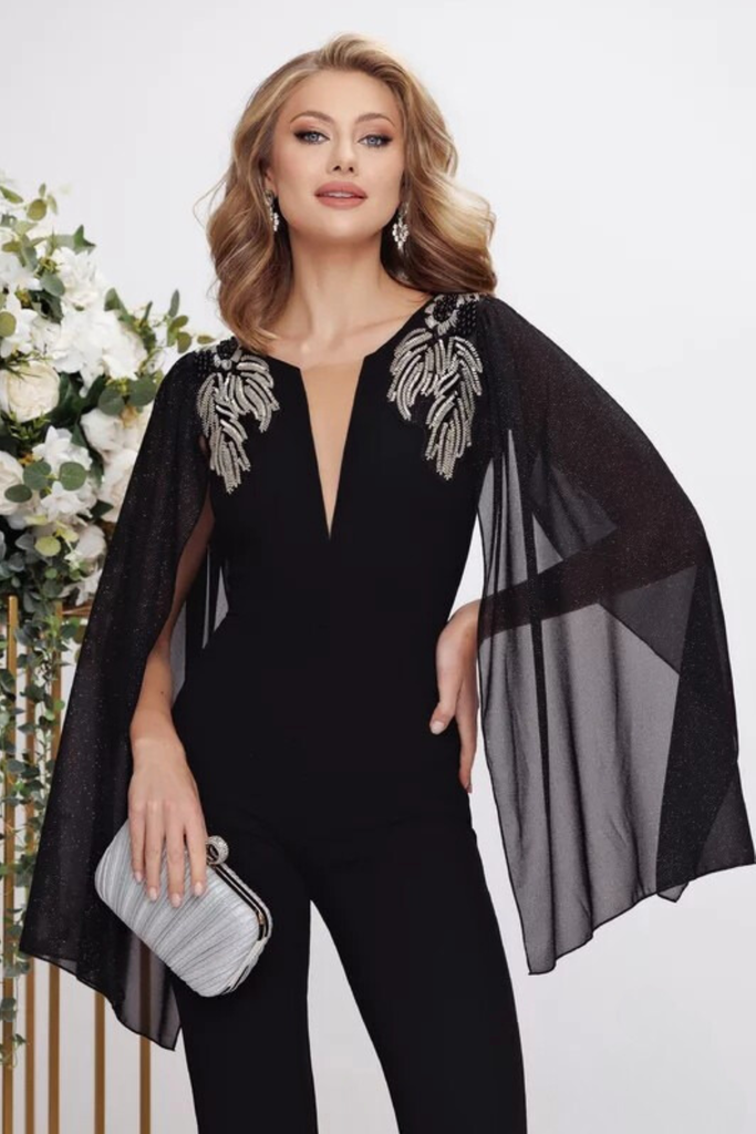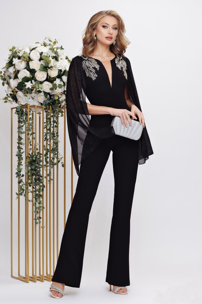 Tuta elegante nera aderente elasticizzata Fofy con maniche aperte e applicazioni argento sulle spalle