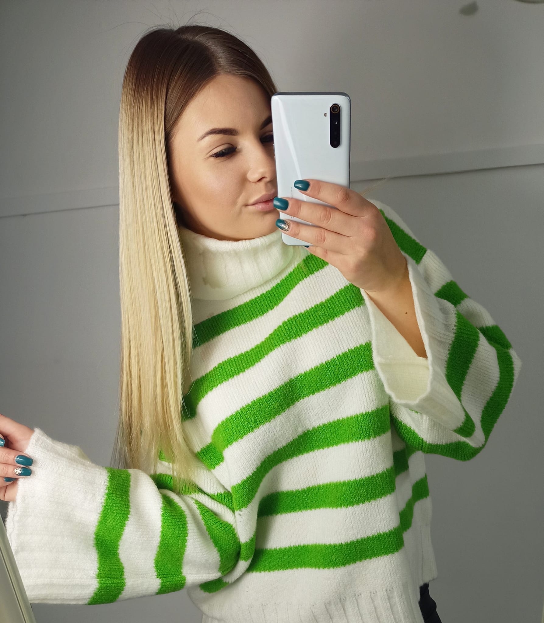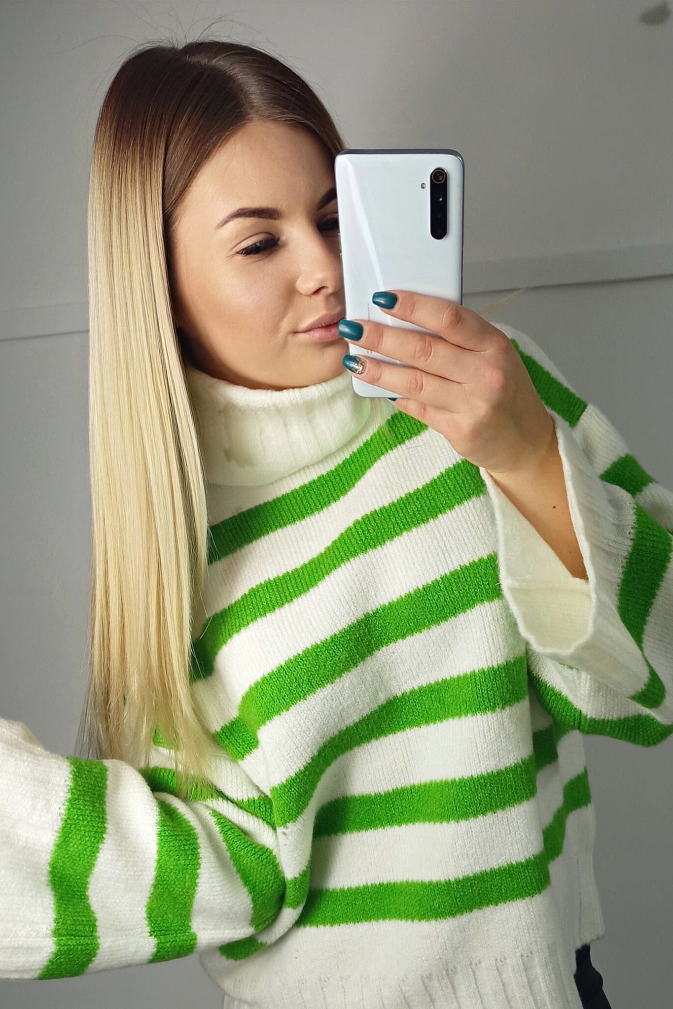 Maglione bianco avorio a righe verdi ampio oversize a collo alto con maniche larghe
