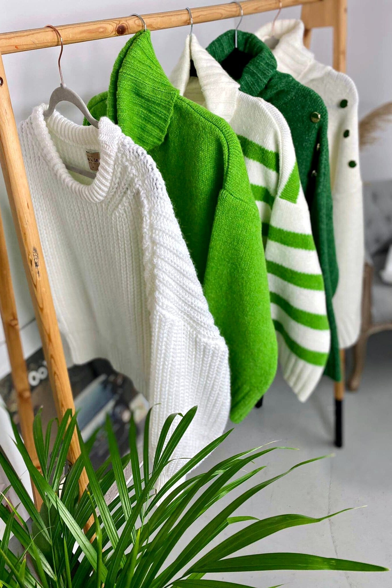 - Maglione comodo dolcevita bianco avorio a righe verdi