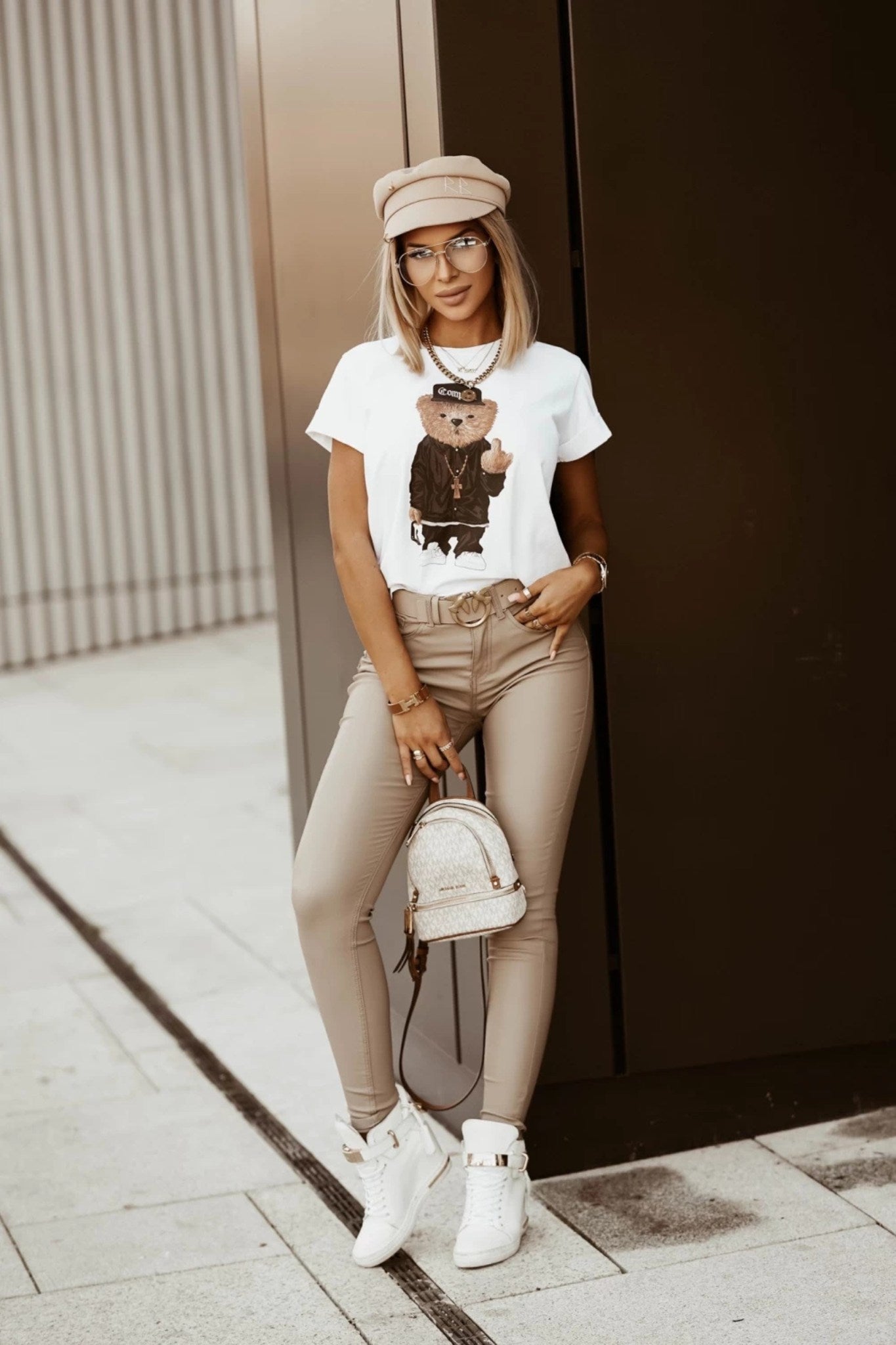 T-shirt bianco in cotone con stampa simpatico orsetto monello e manche corte con risvolto
