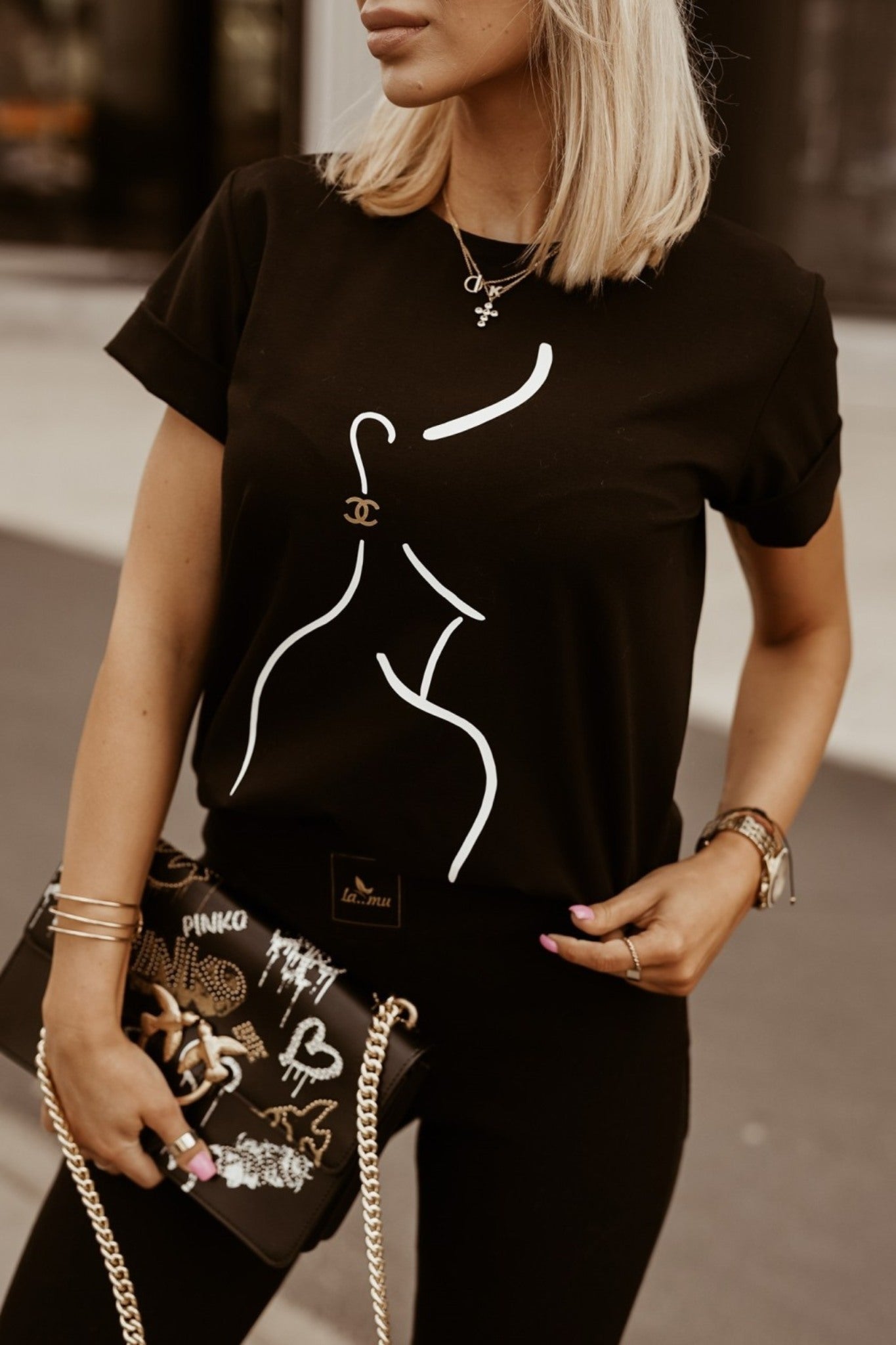 T-shirt nero in cotone con stampa bianca profilo ragazza sul davanti e manche corte con risvolto
