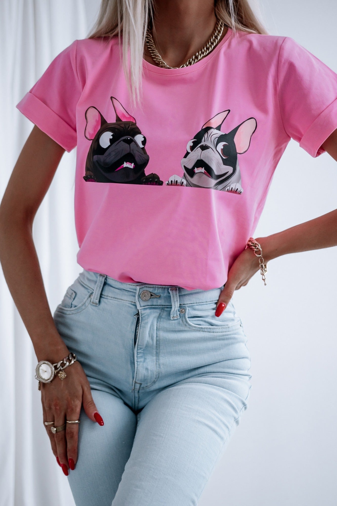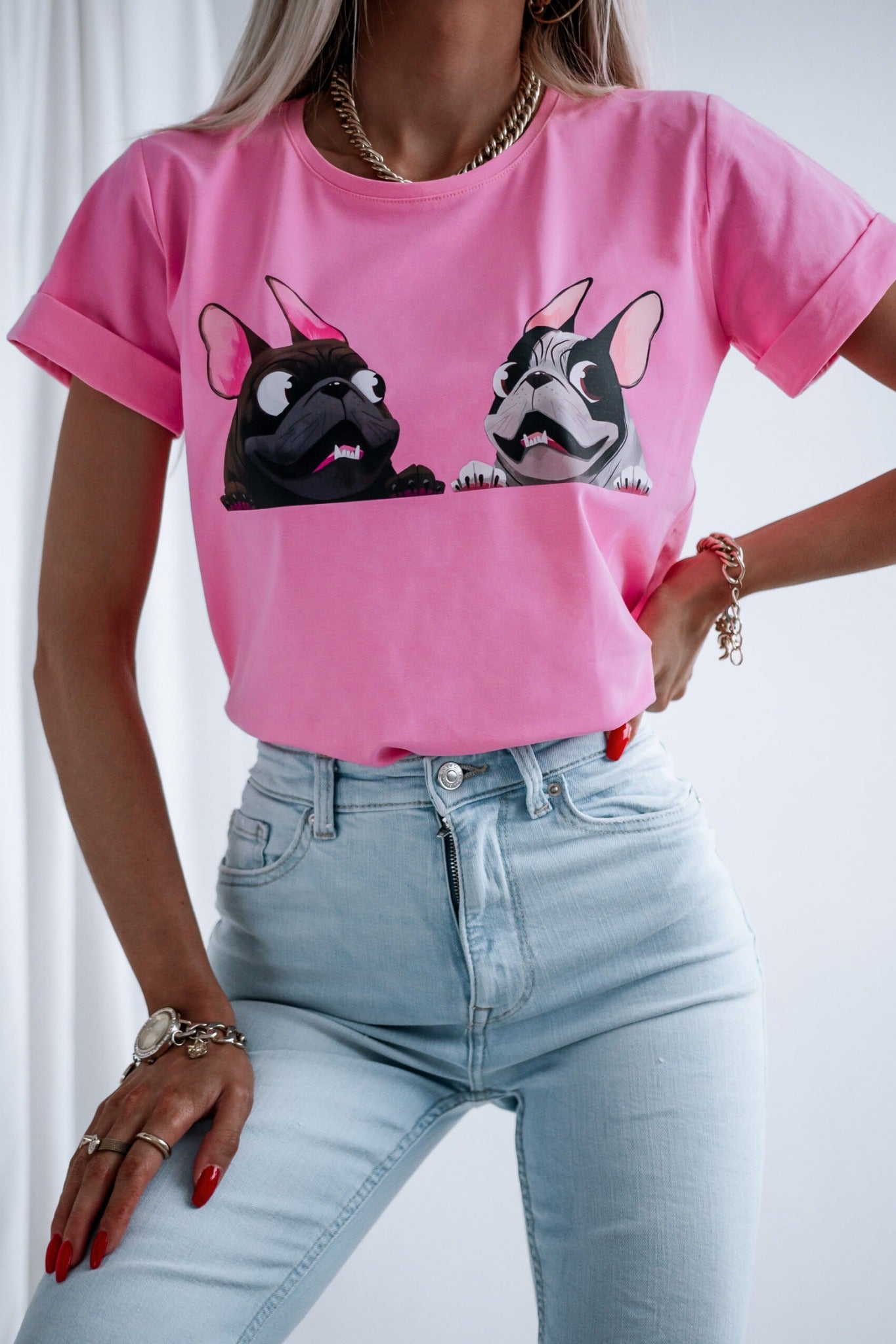 T-shirt rosa in cotone elasticizzato con stampa due cagnolini e manche corte con risvolto