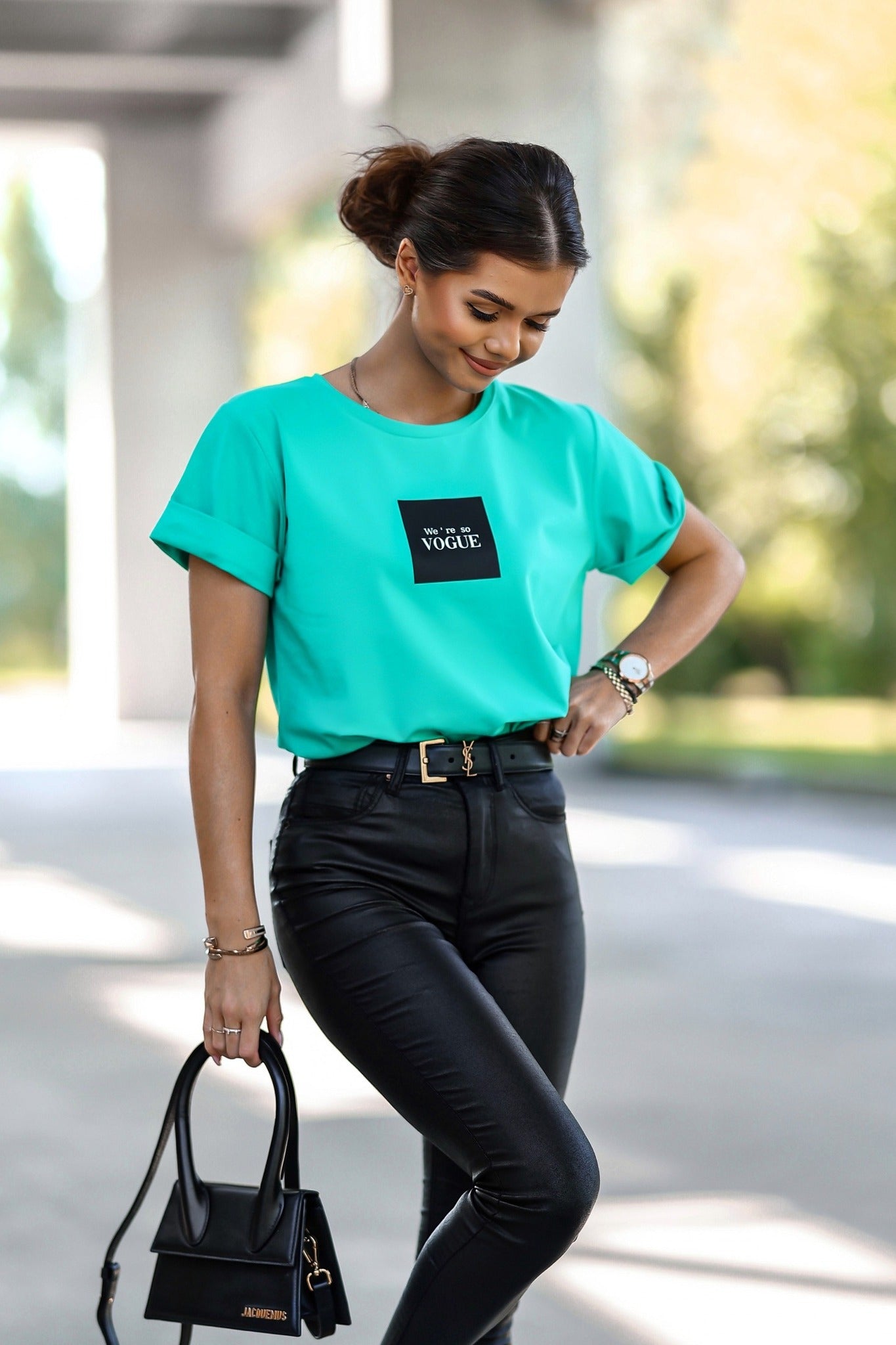 T-shirt verde acqua in cotone con stampa scritta Vogue e manche corte con risvolto