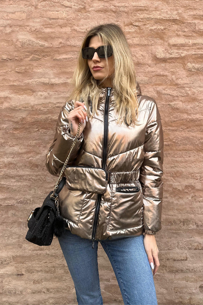 Giacca invernale Denny Rose bronzo laminato con cappuccio e cintura con portafoglio