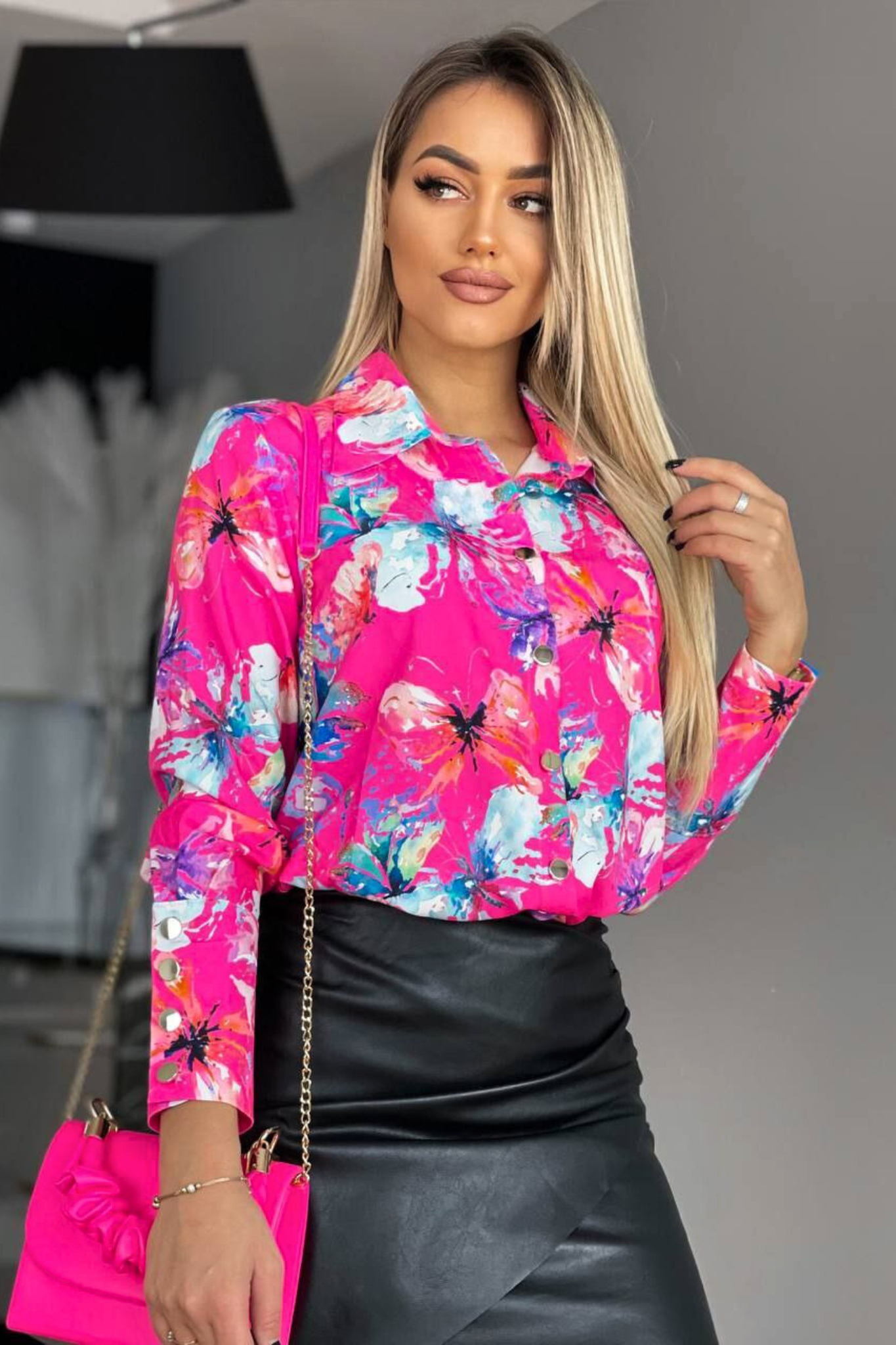 Camicia elegante fucsia a fantasia floreale celeste con bottoni dorati